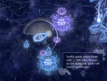 Embrace the role of a spirit guide as you navigate and lead lost souls back to their celestial homes. Swiftly guide your boat to collect and bring spirits home using your mouse's left-click near the boat's radius. Beware, as too many lost spirits will lead to game over.